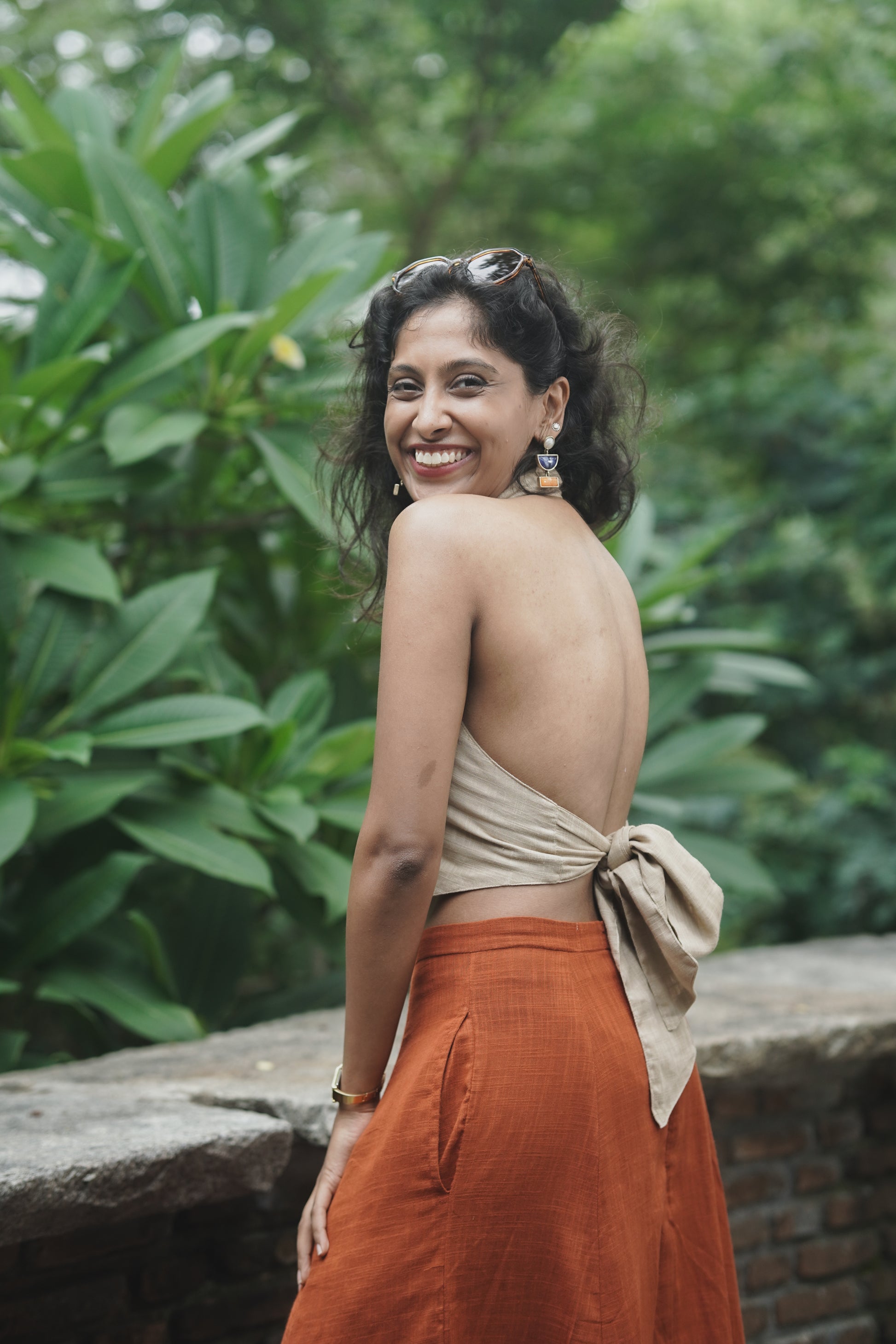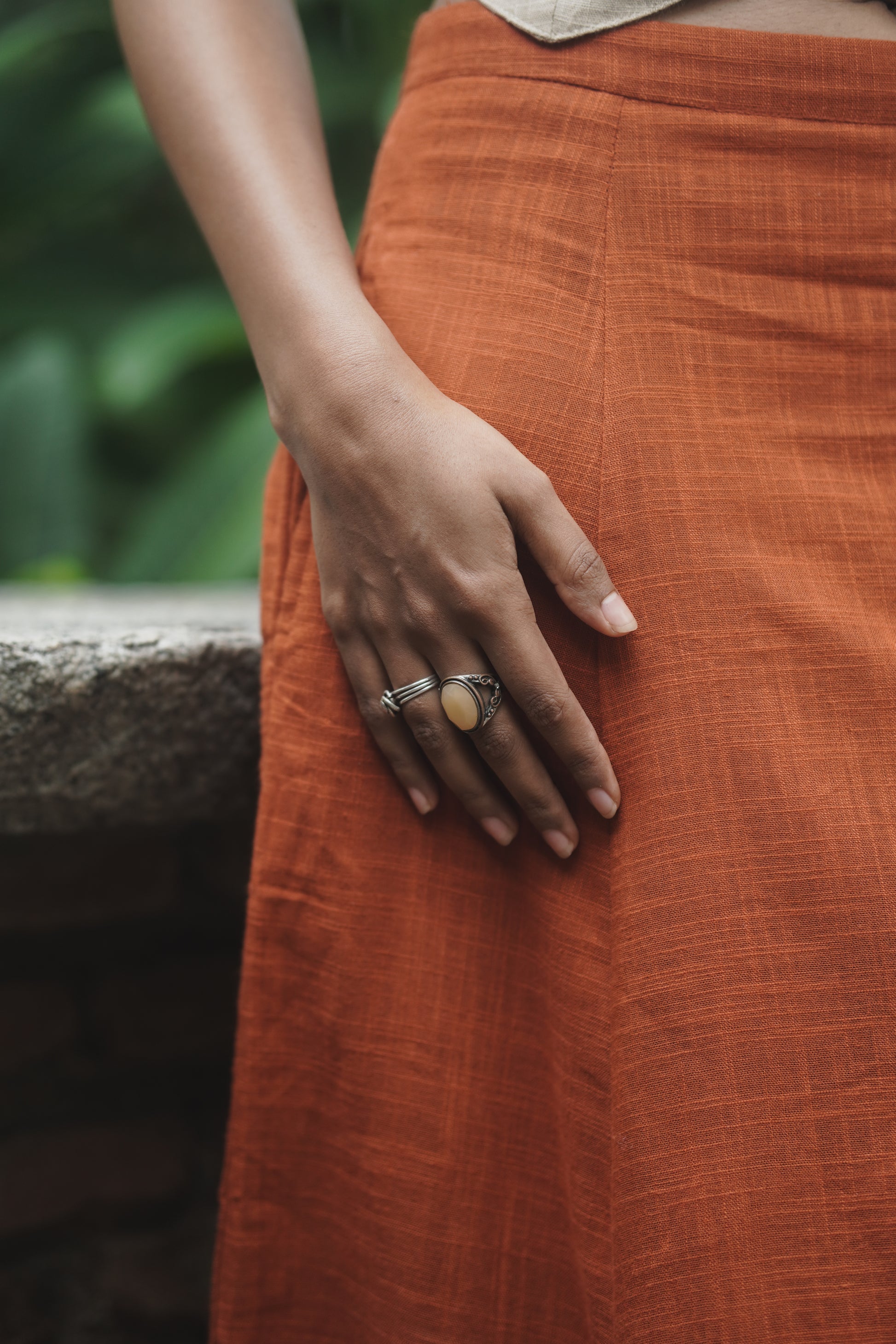 High-waisted skirt made from handloom cotton, featuring a side pocket and back zipper. Pairs well with our halter top for a complete look.