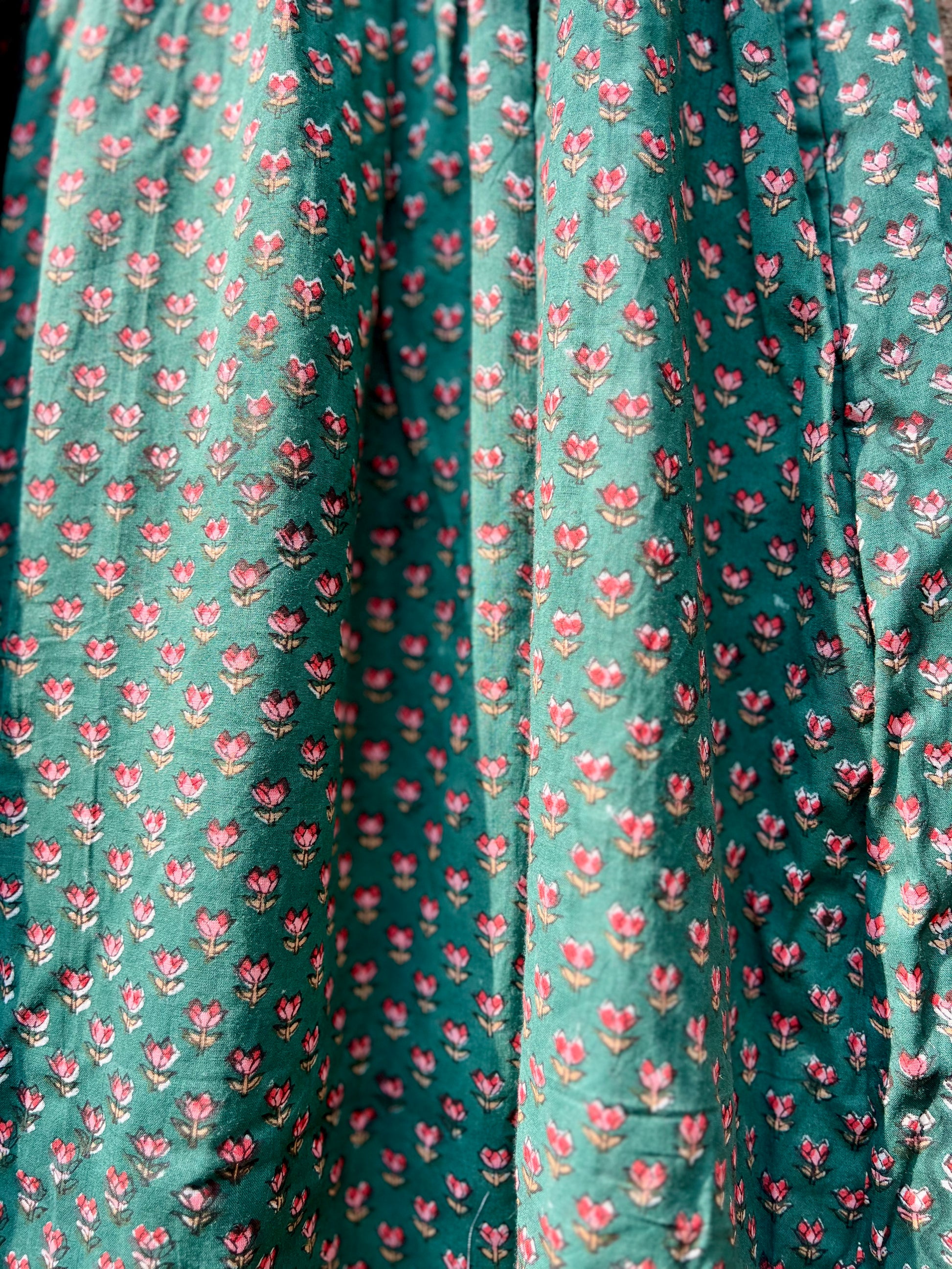 Hand Block Printed The Sun Dress features pintuck detailing, adjustable noodle straps, a fitted chest, and a flowing silhouette. Includes side pockets for added functionality. |
