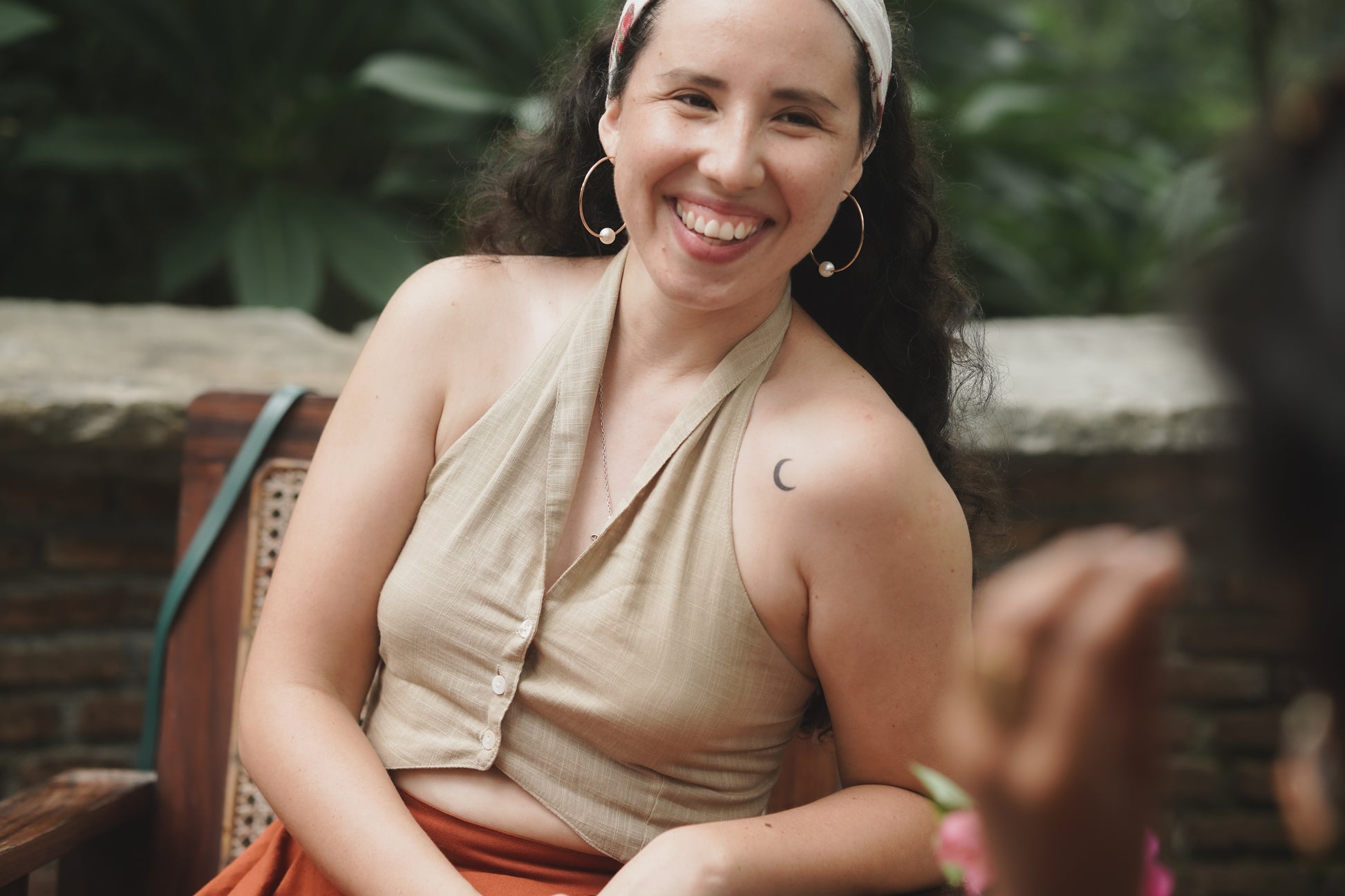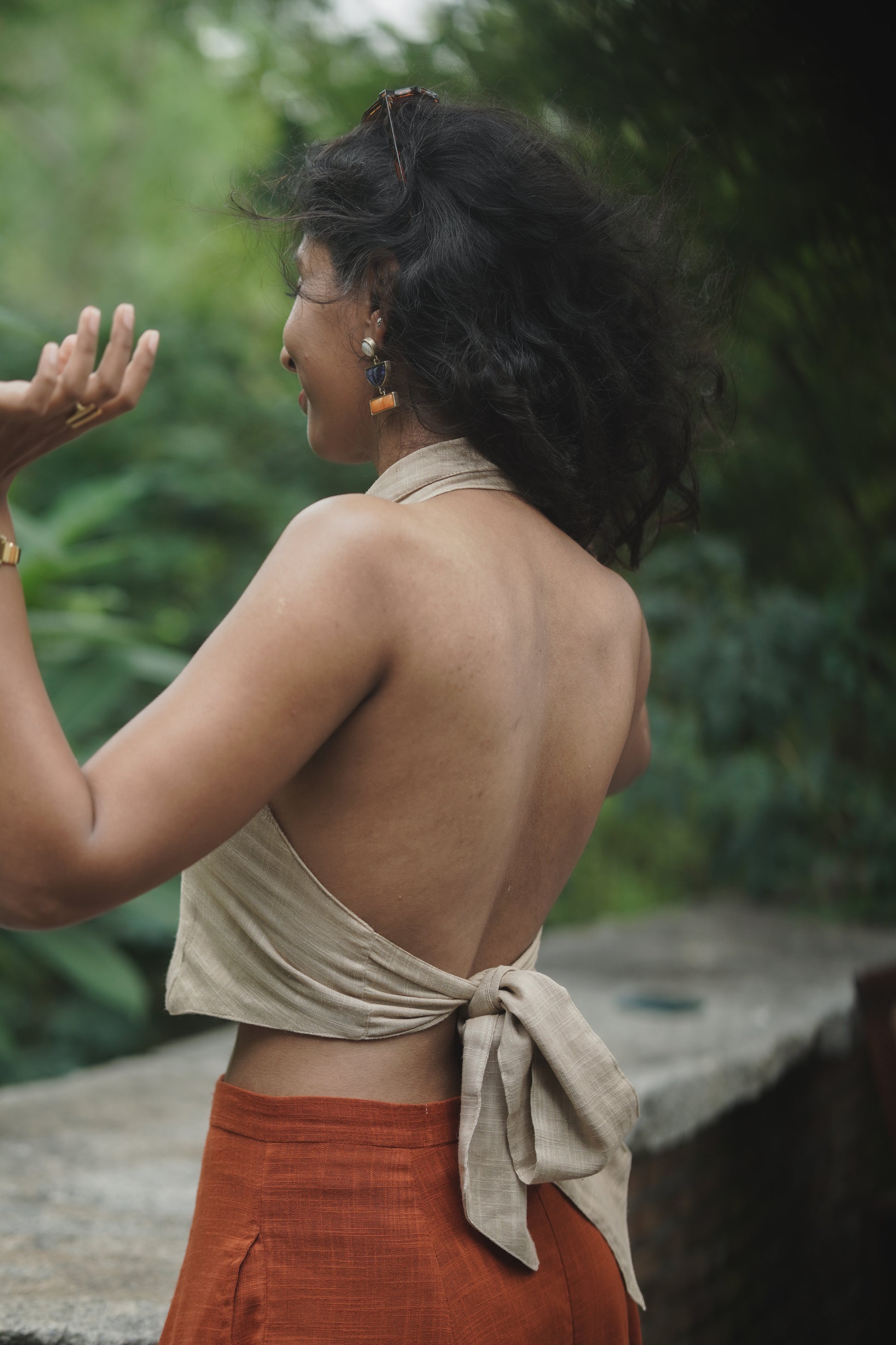 Tie-Back Halter Top made of handloom cotton with front buttons and an adjustable tie at the back for a perfect fit. Pairs well with high-waisted trousers or skirts. Comfortable, simple, and versatile for various styles.